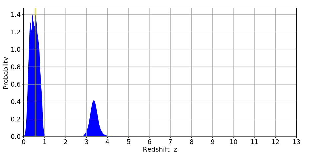 In P(z) plots: Yellow lines mark the cluster redshift z = 0.570,