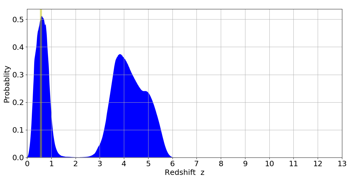 In P(z) plots: Yellow lines mark the cluster redshift z = 0.570,
