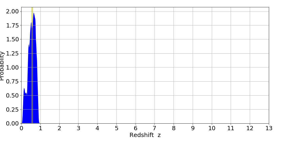 In P(z) plots: Yellow lines mark the cluster redshift z = 0.570,
