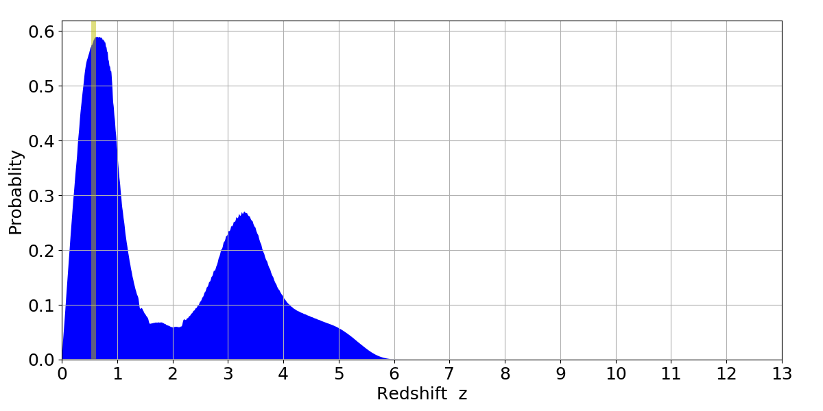 In P(z) plots: Yellow lines mark the cluster redshift z = 0.570,