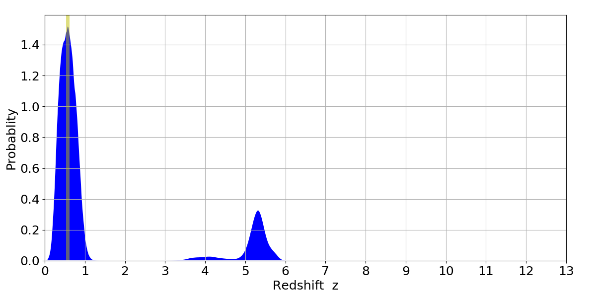 In P(z) plots: Yellow lines mark the cluster redshift z = 0.570,