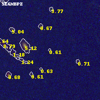 Object #814 x,y = (4636, 4381) RA, Dec = (11:57:59.736, -10:46:32.52) = (179.49890, -10.77570) BPZ = 0.609 [0.223--5.237] type = 8.40 (SB1_B10 - SB2_B10) chisq2 = 0.95 ODDS = 0.07 z_cluster = 0.570