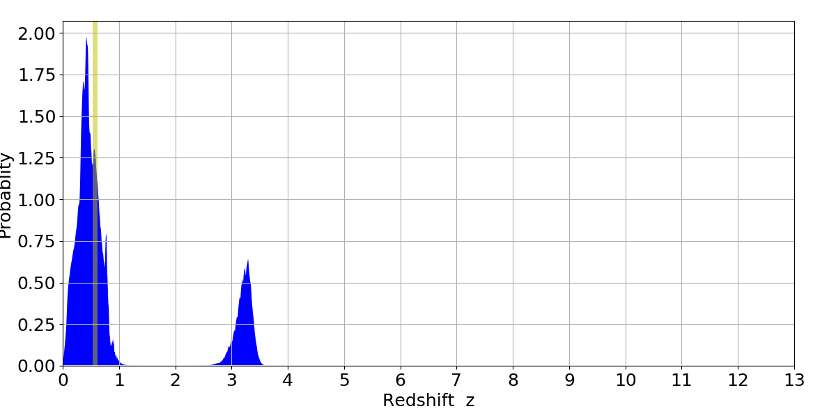 In P(z) plots: Yellow lines mark the cluster redshift z = 0.570,