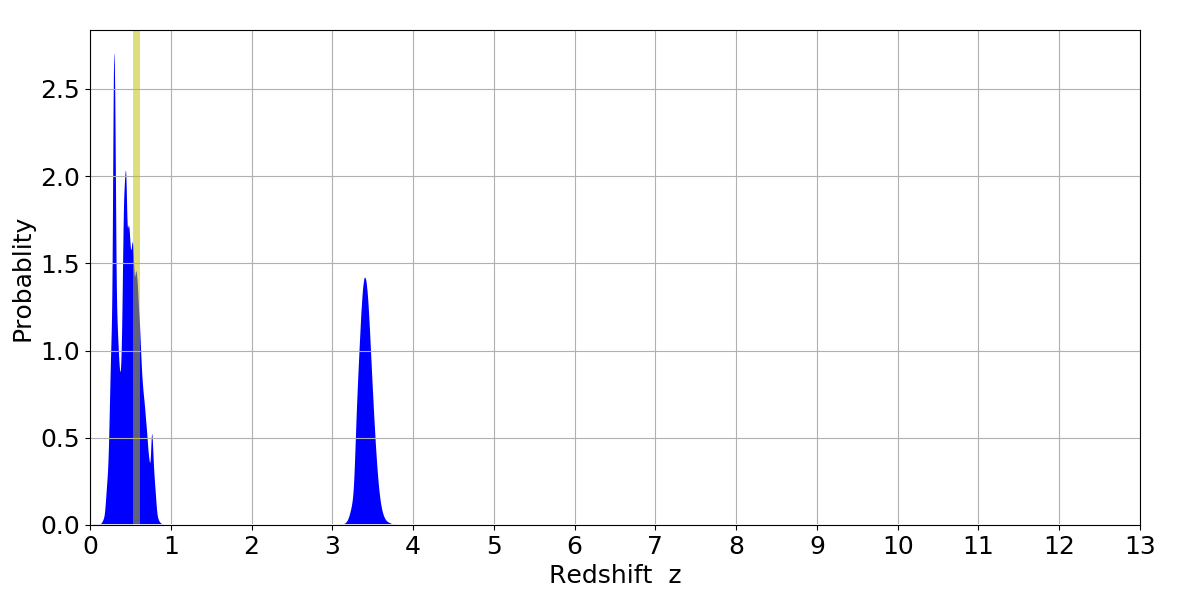 In P(z) plots: Yellow lines mark the cluster redshift z = 0.570,