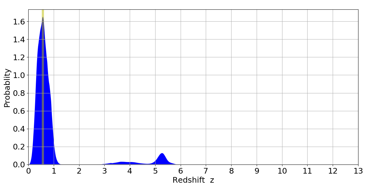In P(z) plots: Yellow lines mark the cluster redshift z = 0.570,