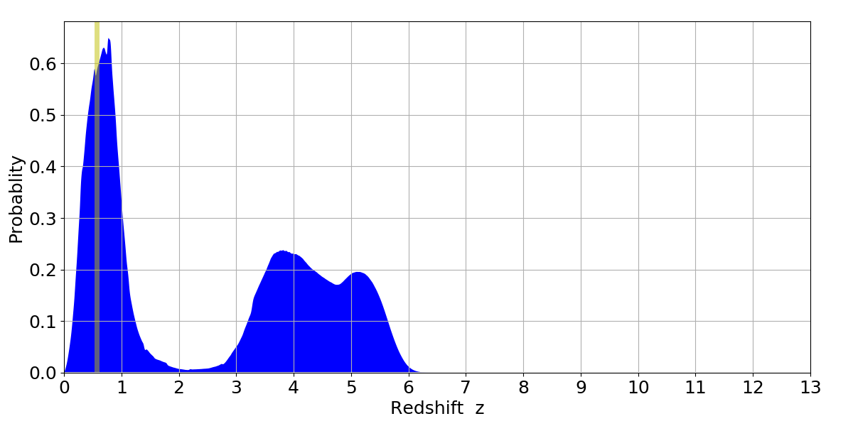 In P(z) plots: Yellow lines mark the cluster redshift z = 0.570,