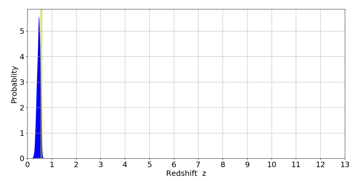 In P(z) plots: Yellow lines mark the cluster redshift z = 0.570,
