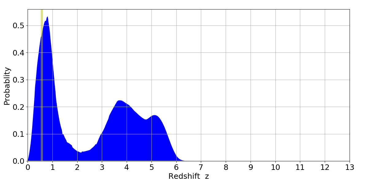 In P(z) plots: Yellow lines mark the cluster redshift z = 0.570,