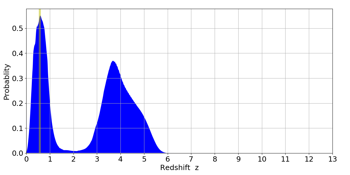 In P(z) plots: Yellow lines mark the cluster redshift z = 0.570,
