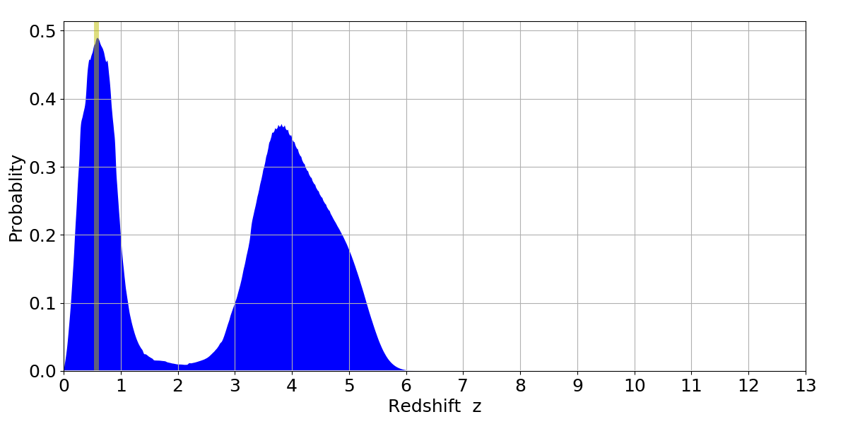 In P(z) plots: Yellow lines mark the cluster redshift z = 0.570,