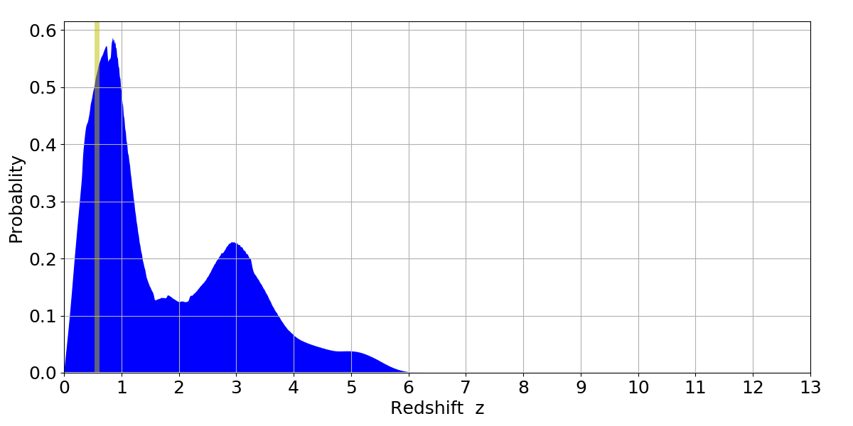 In P(z) plots: Yellow lines mark the cluster redshift z = 0.570,