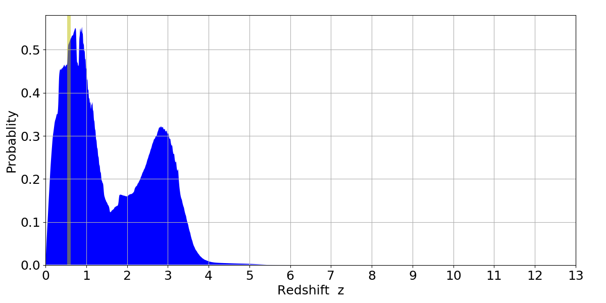 In P(z) plots: Yellow lines mark the cluster redshift z = 0.570,