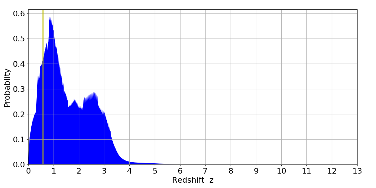 In P(z) plots: Yellow lines mark the cluster redshift z = 0.570,