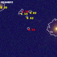 Object #985 x,y = (5282, 3540) RA, Dec = (11:57:57.096, -10:47:22.92) = (179.48790, -10.78970) BPZ = 0.534 [0.238--5.196] type = 7.80 (SB1_B10 - Scd_B10) chisq2 = 1.36 ODDS = 0.10 z_cluster = 0.570