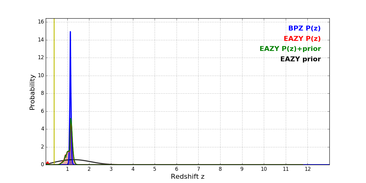 In P(z) plots: Yellow lines mark the cluster redshift z = 0.390,