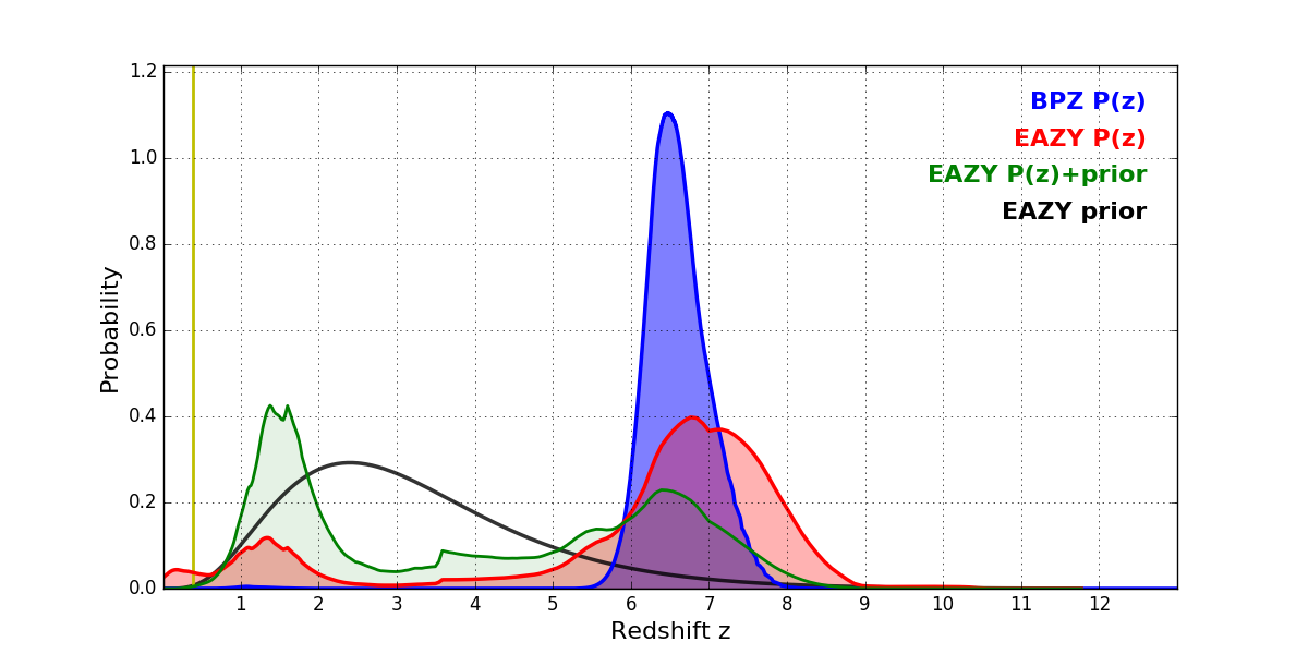 In P(z) plots: Yellow lines mark the cluster redshift z = 0.390,