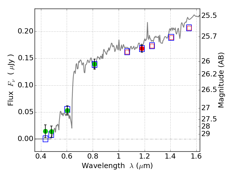 Object #2779   x,y = (1296, 3114)   RA, Dec = (11:50:56.856, -28:04:19.56) = (177.73690, -28.07210)   BPZ = 4.261 [0.714--4.513]   type = 8.50 (SB2_B10 - SB1_B10)   stellarity = 0.96   chisq2 = 0.38   ODDS = 0.82   z_cluster = 0.390