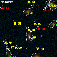 Black segments are analyzed here. Roll mouse over color images to view segments. Best viewed in a wide browser window (1200 pixels or more). Download SED & P(z) plots to view larger versions.