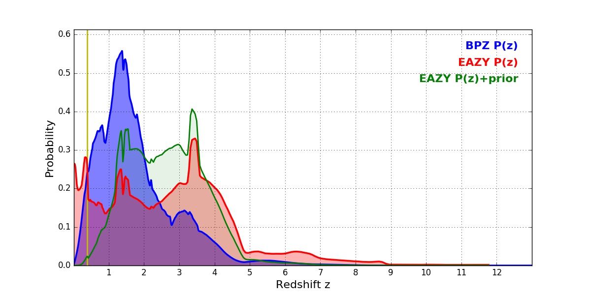 In P(z) plots: Yellow lines mark the cluster redshift z = 0.390,