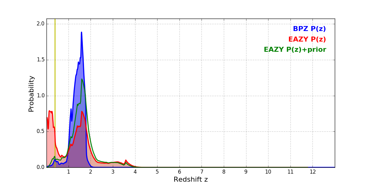 In P(z) plots: Yellow lines mark the cluster redshift z = 0.390,