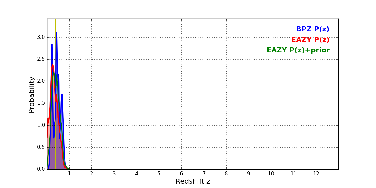 In P(z) plots: Yellow lines mark the cluster redshift z = 0.390,
