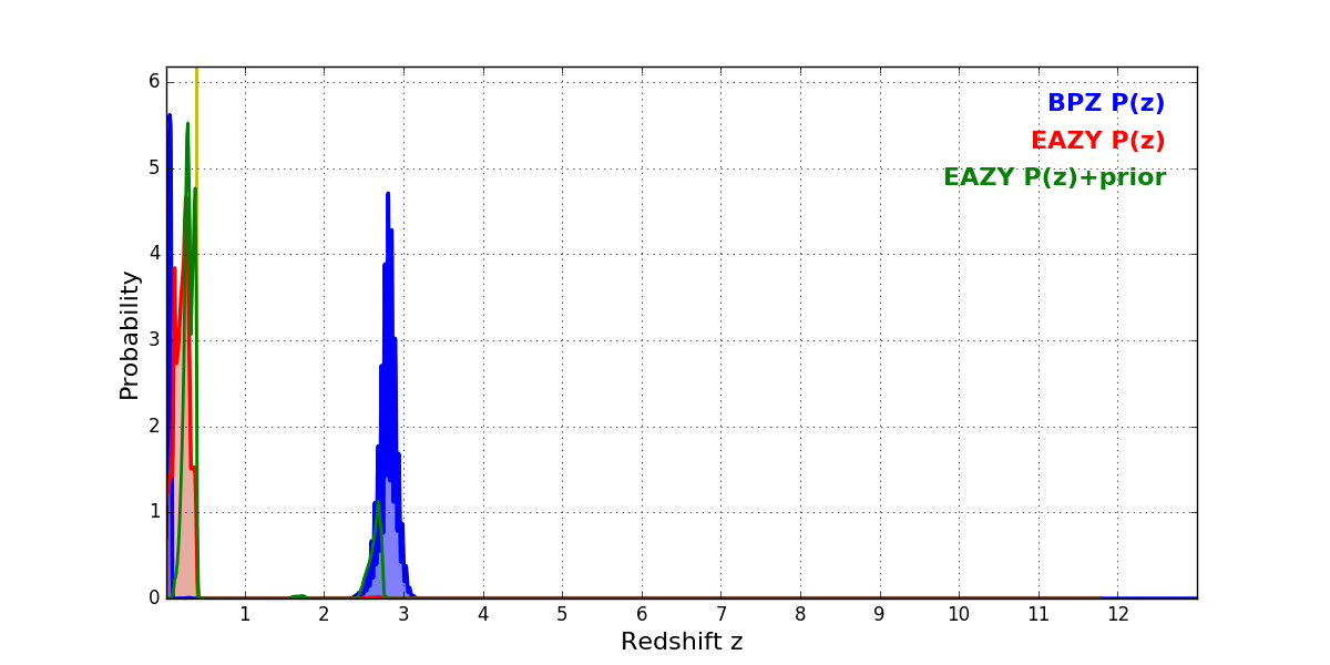 In P(z) plots: Yellow lines mark the cluster redshift z = 0.390,