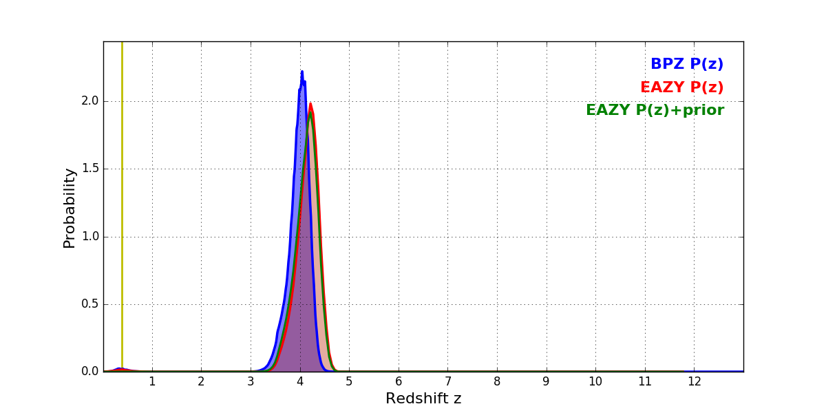 In P(z) plots: Yellow lines mark the cluster redshift z = 0.390,