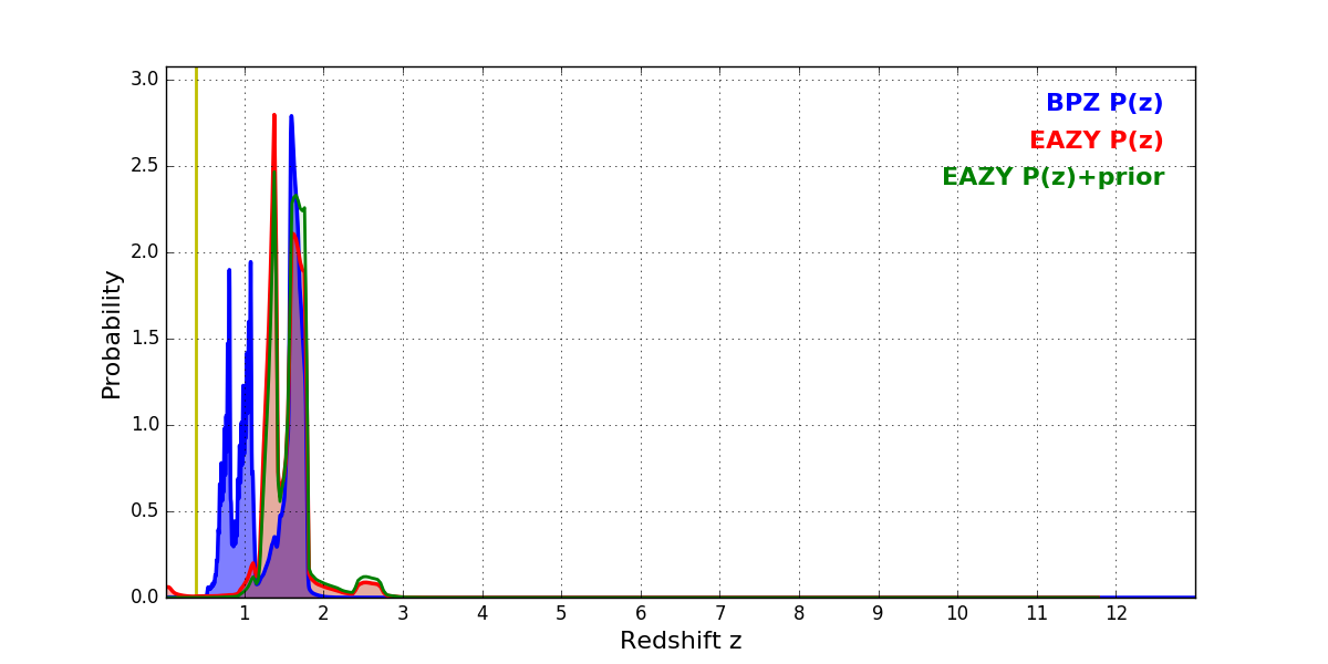 In P(z) plots: Yellow lines mark the cluster redshift z = 0.390,