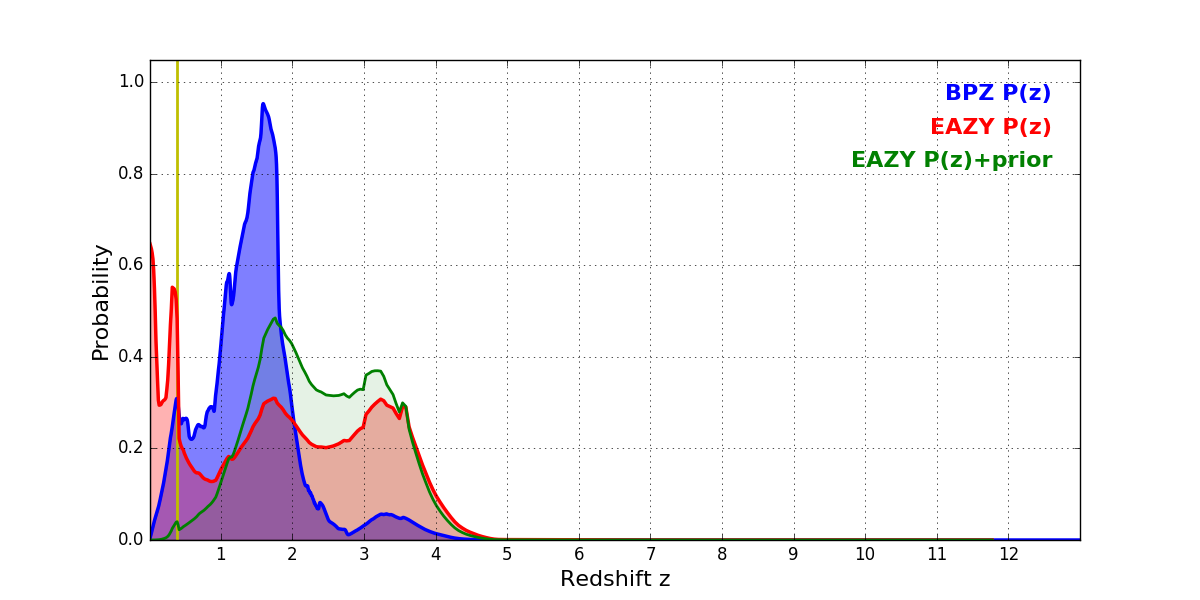 In P(z) plots: Yellow lines mark the cluster redshift z = 0.390,