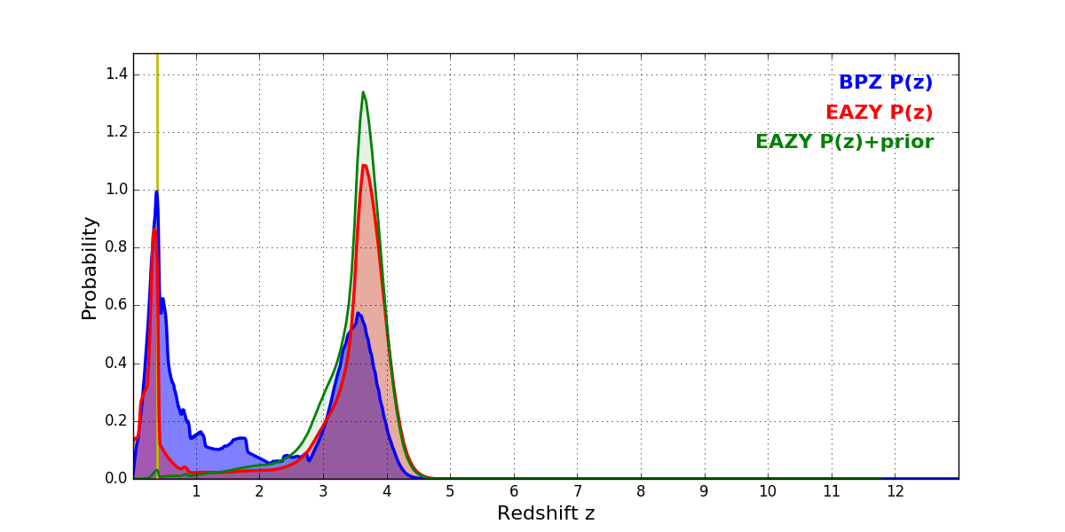 In P(z) plots: Yellow lines mark the cluster redshift z = 0.390,