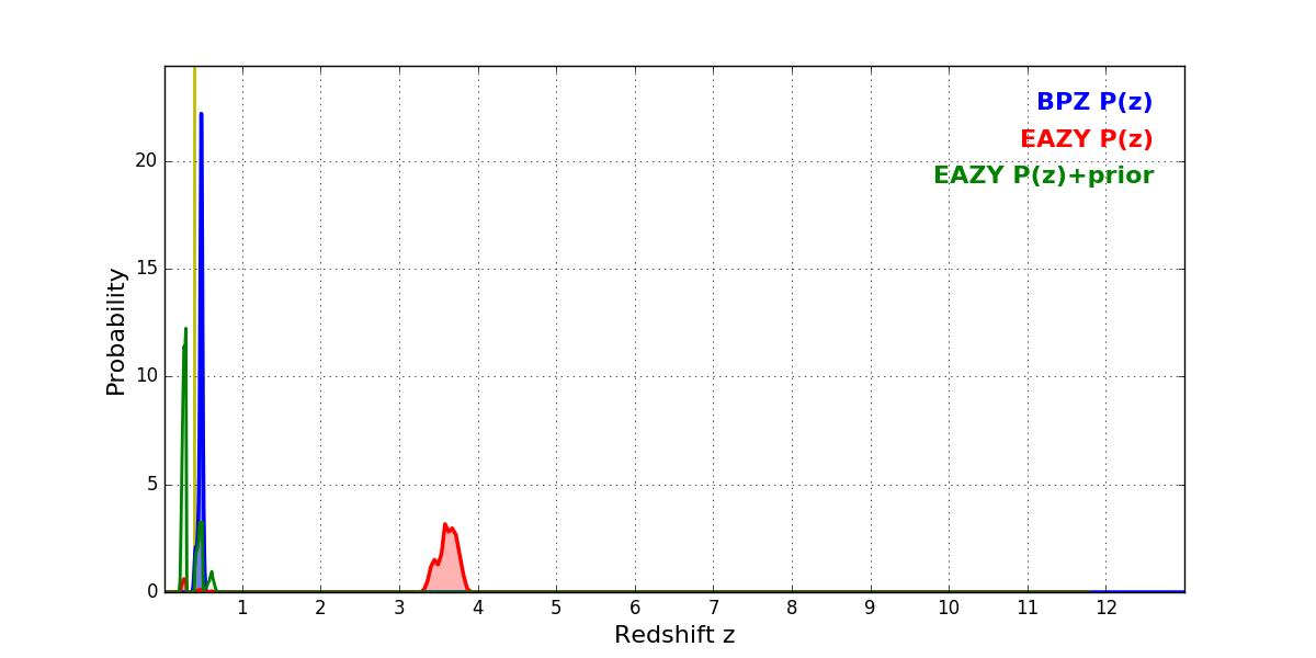 In P(z) plots: Yellow lines mark the cluster redshift z = 0.390,