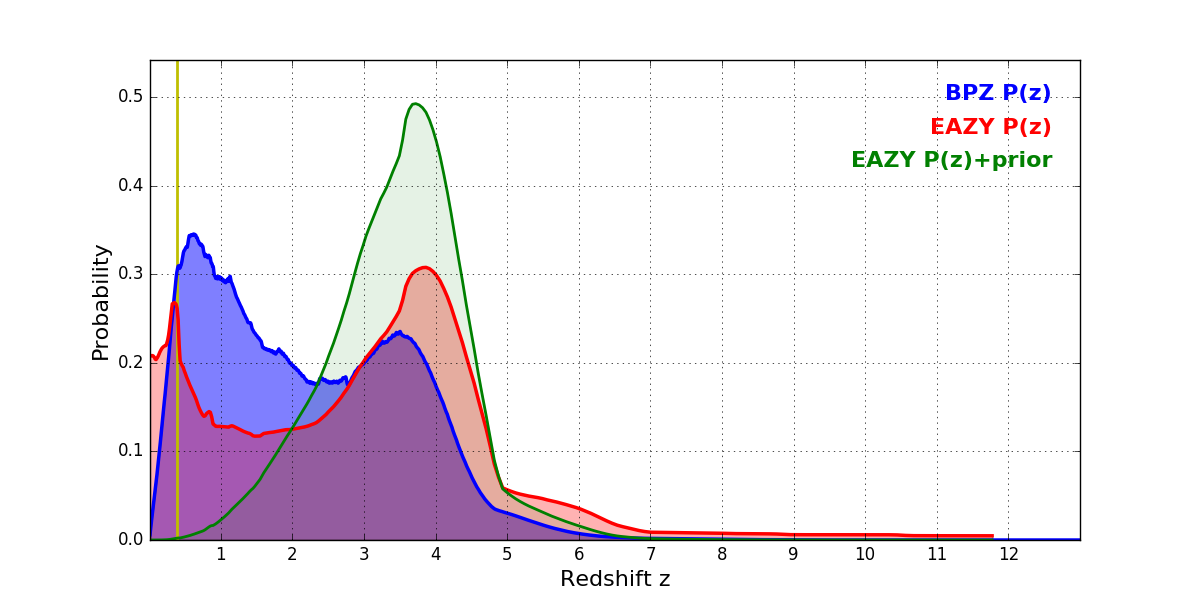 In P(z) plots: Yellow lines mark the cluster redshift z = 0.390,