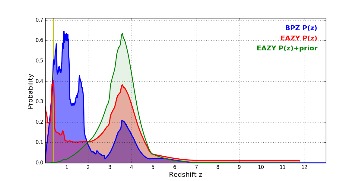 In P(z) plots: Yellow lines mark the cluster redshift z = 0.390,