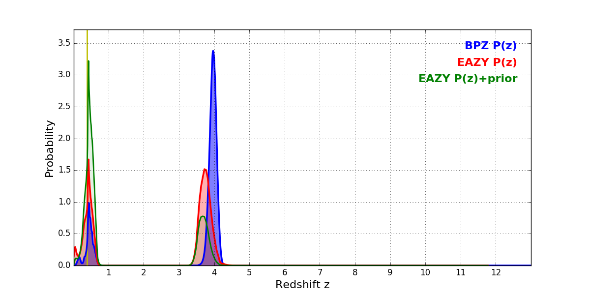 In P(z) plots: Yellow lines mark the cluster redshift z = 0.390,