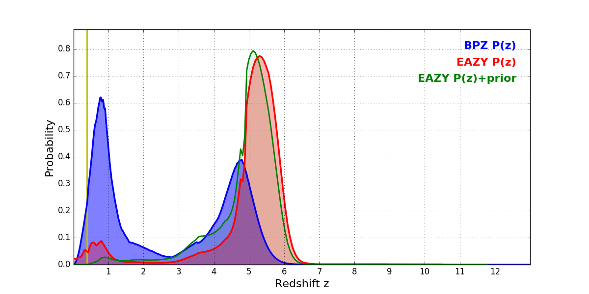 In P(z) plots: Yellow lines mark the cluster redshift z = 0.390,