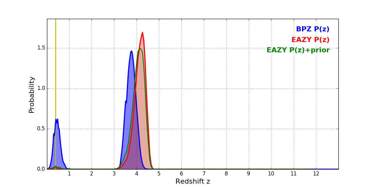 In P(z) plots: Yellow lines mark the cluster redshift z = 0.390,