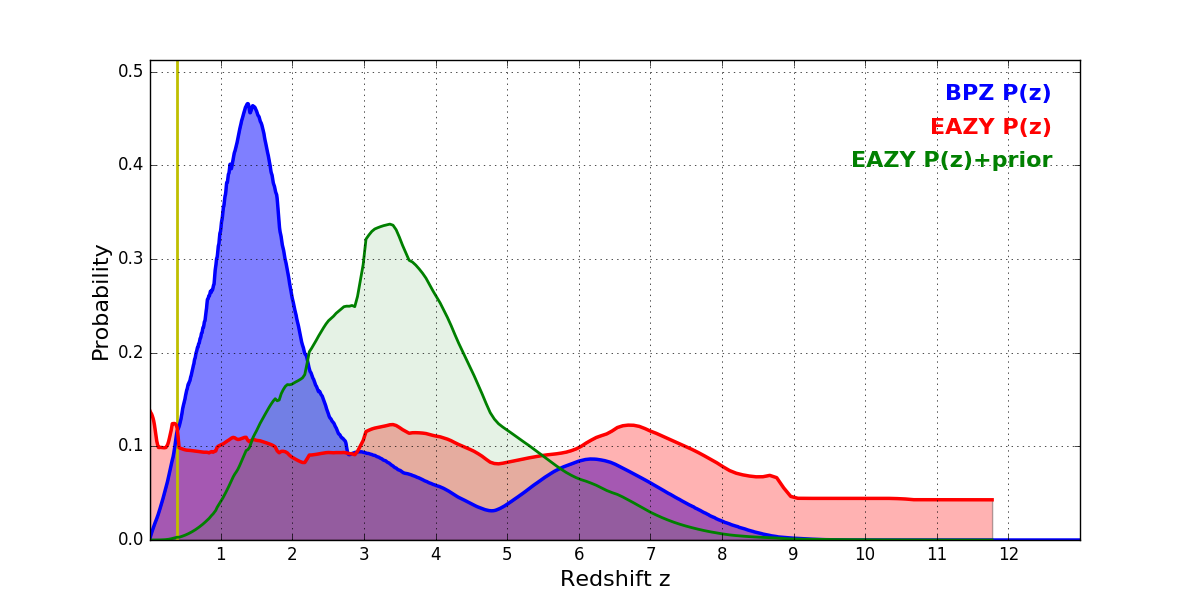 In P(z) plots: Yellow lines mark the cluster redshift z = 0.390,