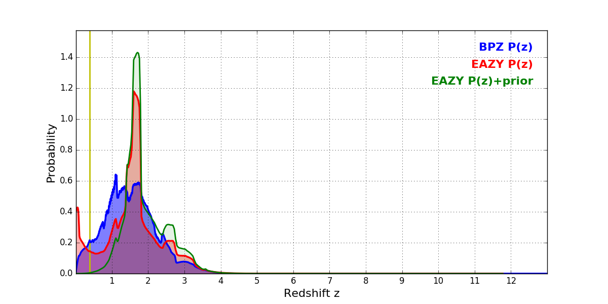 In P(z) plots: Yellow lines mark the cluster redshift z = 0.390,
