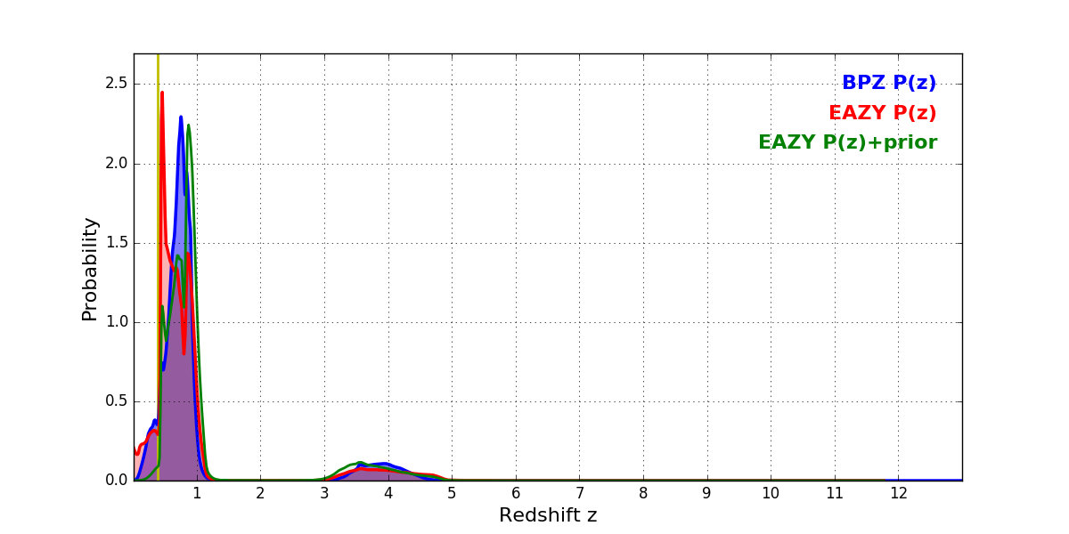 In P(z) plots: Yellow lines mark the cluster redshift z = 0.390,
