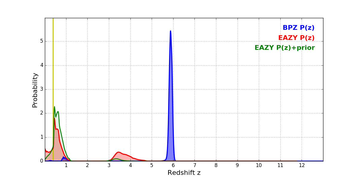 In P(z) plots: Yellow lines mark the cluster redshift z = 0.390,