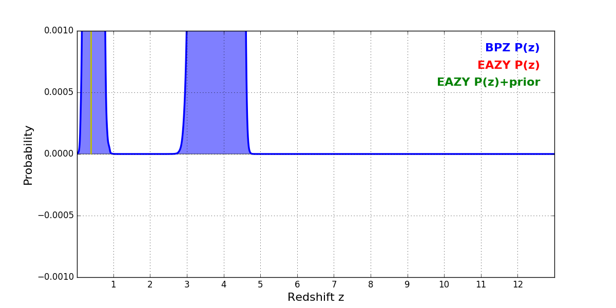 In P(z) plots: Yellow lines mark the cluster redshift z = 0.390,