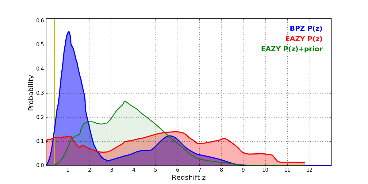 In P(z) plots: Yellow lines mark the cluster redshift z = 0.390,