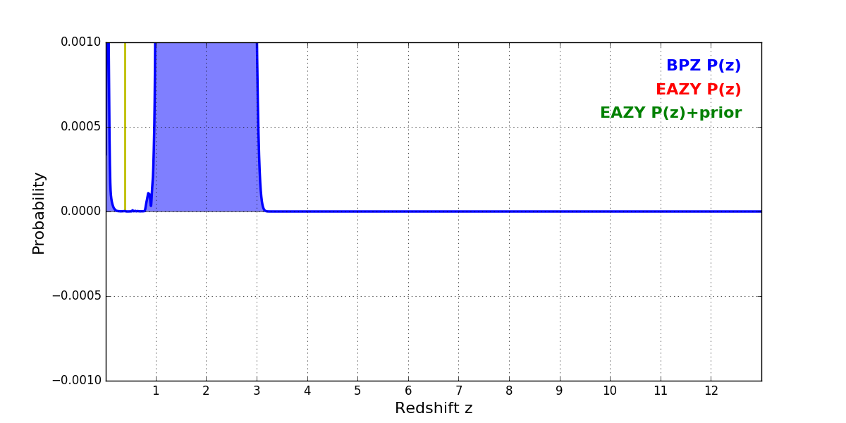 In P(z) plots: Yellow lines mark the cluster redshift z = 0.390,