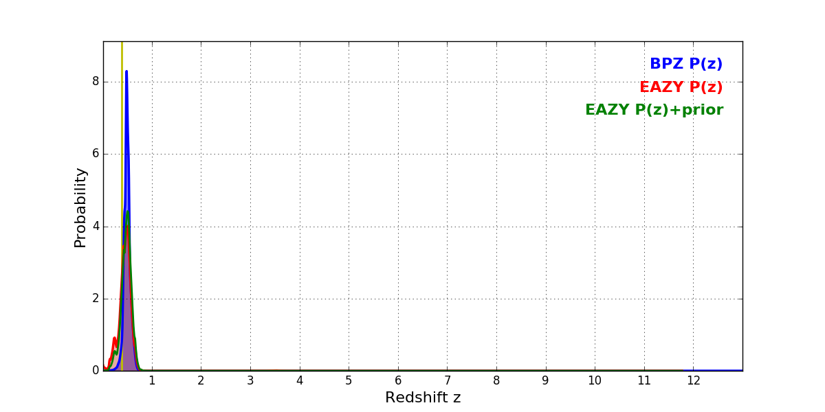 In P(z) plots: Yellow lines mark the cluster redshift z = 0.390,