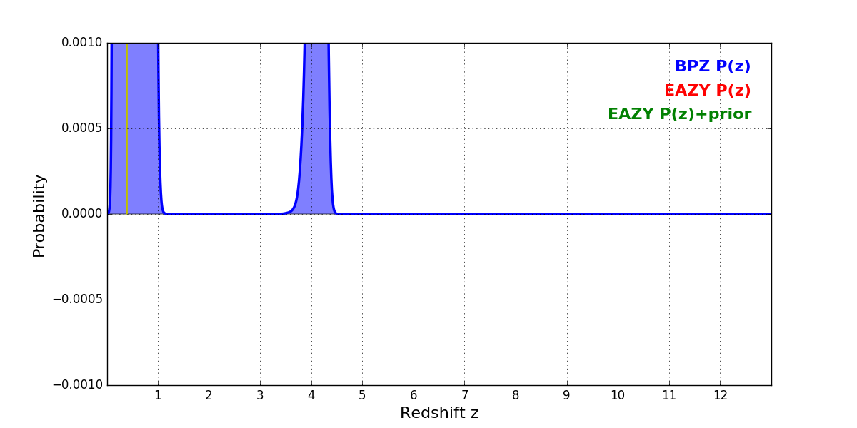 In P(z) plots: Yellow lines mark the cluster redshift z = 0.390,