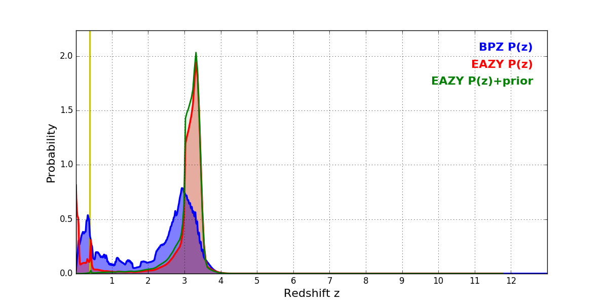 In P(z) plots: Yellow lines mark the cluster redshift z = 0.390,