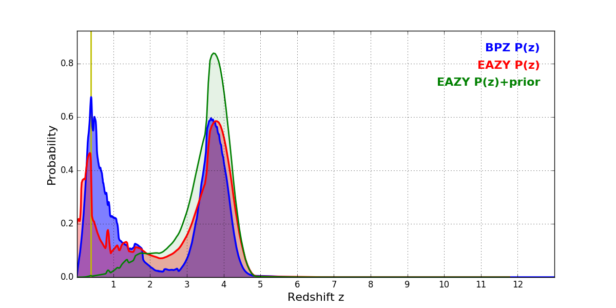 In P(z) plots: Yellow lines mark the cluster redshift z = 0.390,