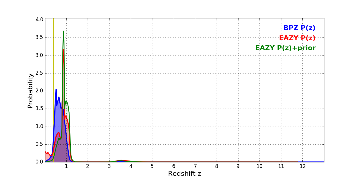 In P(z) plots: Yellow lines mark the cluster redshift z = 0.390,