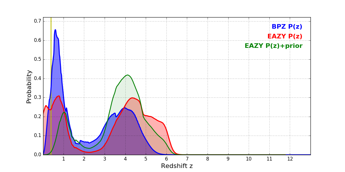 In P(z) plots: Yellow lines mark the cluster redshift z = 0.390,