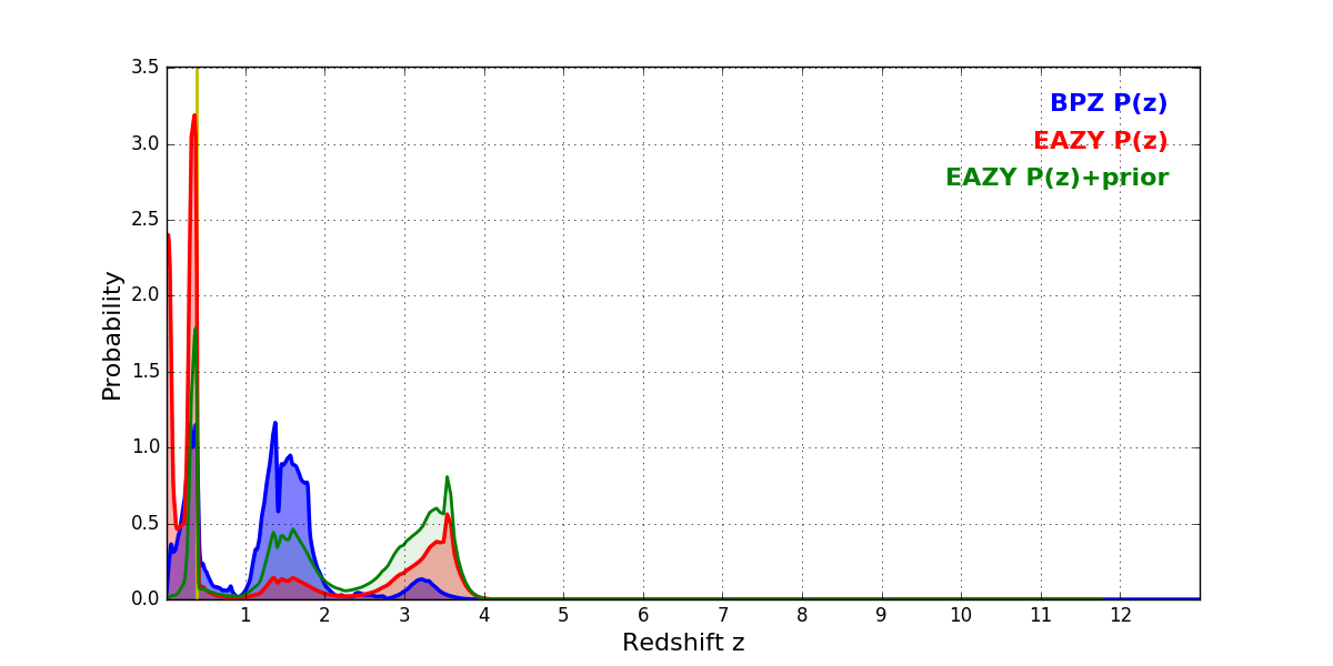 In P(z) plots: Yellow lines mark the cluster redshift z = 0.390,